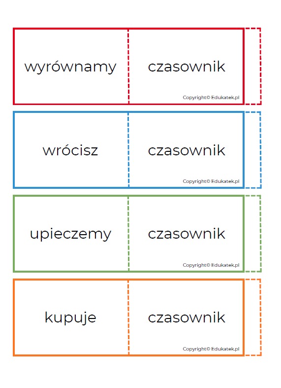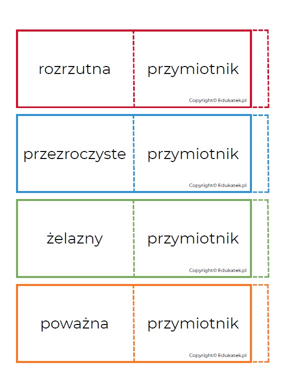 Aby przygotować dwustronne fiszki, należy zgiąć wycięte elementy na pół – w miejscu przerywanej linii, a z drugiej strony zabezpieczyć zakładką, również oznaczoną linią przerywaną. Tak przygotowane karty są gotowe do nauki.