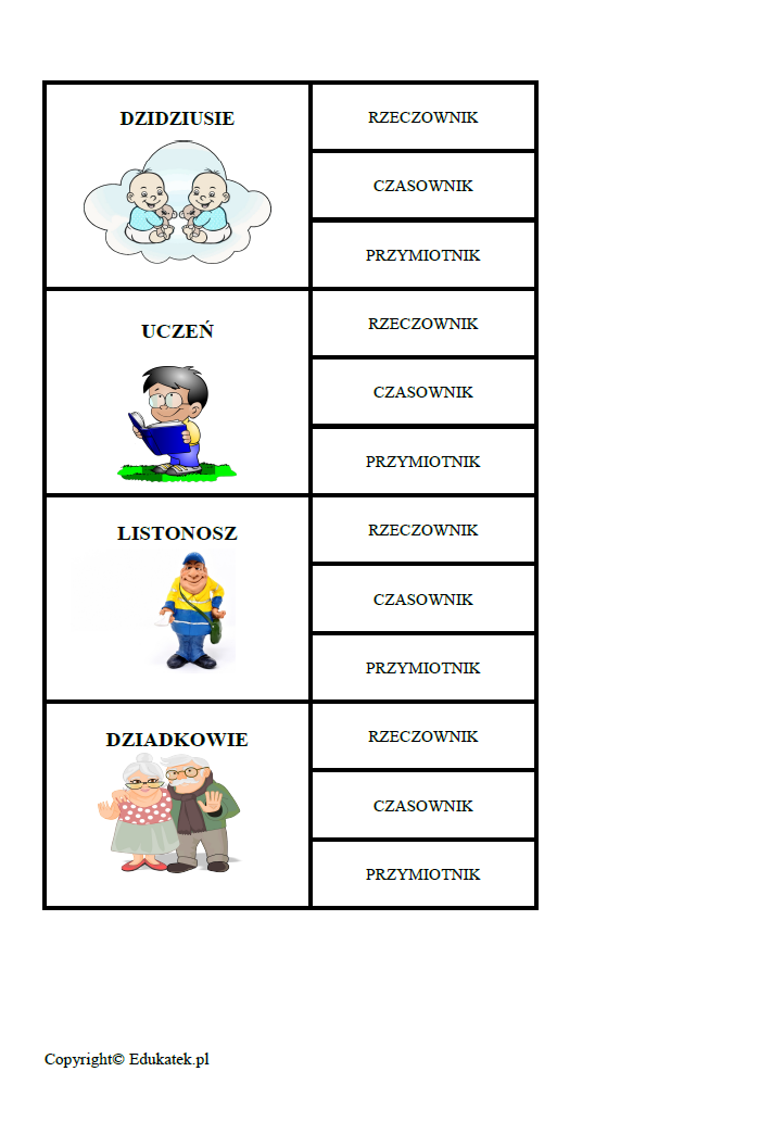 Gra utrwalająca prawidłowe wskazywanie podstawowych części mowy – zestaw kart zawierających ćwiczenia gramatyczne. Podczas zabawy dzieci utrwalają gramatykę (w zakresie rzeczowników, czasowników i przymiotników).