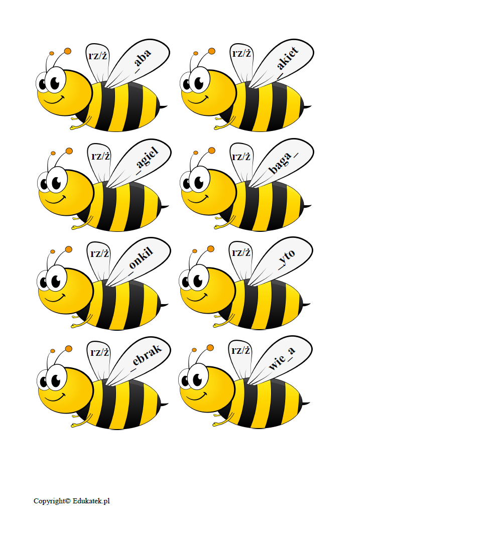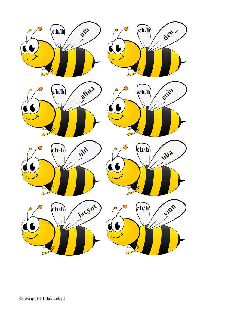 Gra ortograficzna – zestaw elementów umożliwiający doskonalenie ortografii. Podczas zabawy dzieci utrwalają prawidłową pisownię wyrazów z trudnością ortograficzną (u, ó, h, ch, ż, rz). W skład zestawu wchodzi 30 stron – 186 pszczół, na których napisane są wyrazy oraz 6 kart, które należy rozłożyć na stoliku, dywanie, itp. Przygotowany zestaw ma bardzo dużo możliwości wykorzystania.