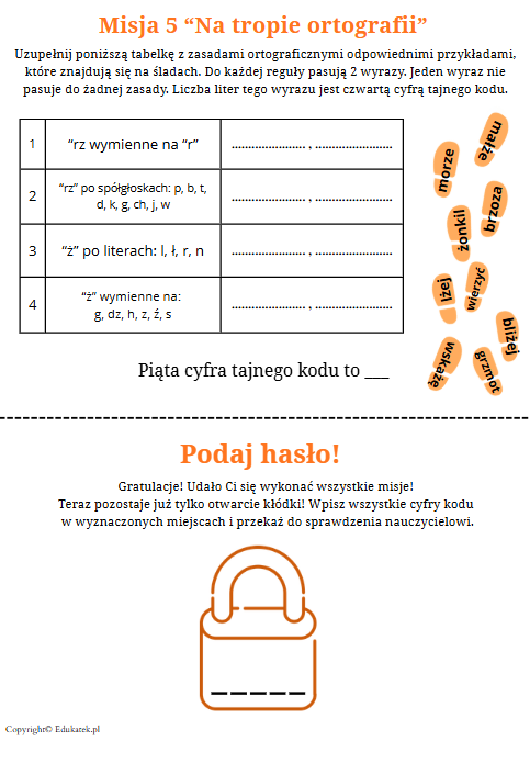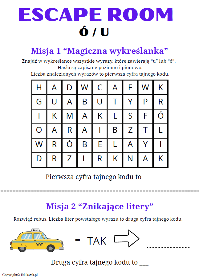 Ortograficzny escape room to zestaw gier i łamigłówek umożliwiający doskonalenie ortografii (ch/h, rz/ż oraz u/ó). Zestaw liczy 12 stron do samodzielnego wydrukowania. Znajdują się w nim 3 karty pracy typu escape room, które umożliwiają doskonalenie różnych trudności ortograficznych (ó/u, rz/ż, oraz ch/h) Każda z nich zawiera 5 „misji”, takich jak krzyżówki, wykreślanki, sudoku, rebusy, rozsypanki literowe i sylabowe itp. Do każdej karty pracy dołączona jest karta rozwiązań z poprawnymi odpowiedziami.
