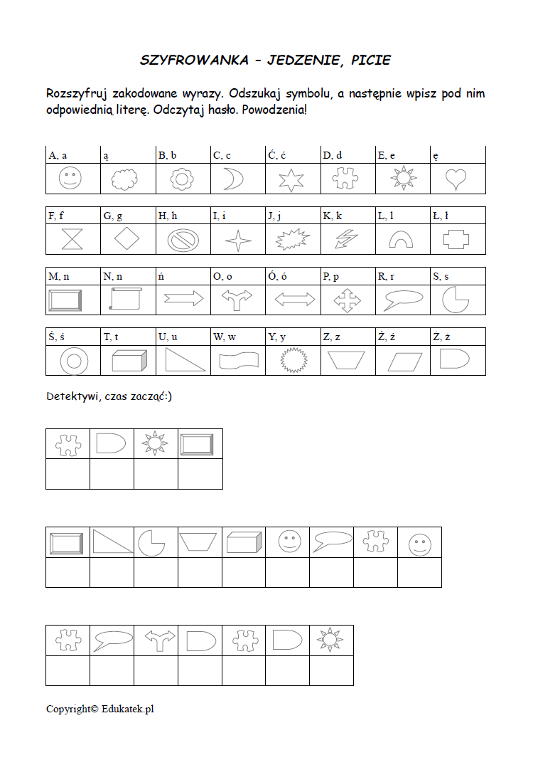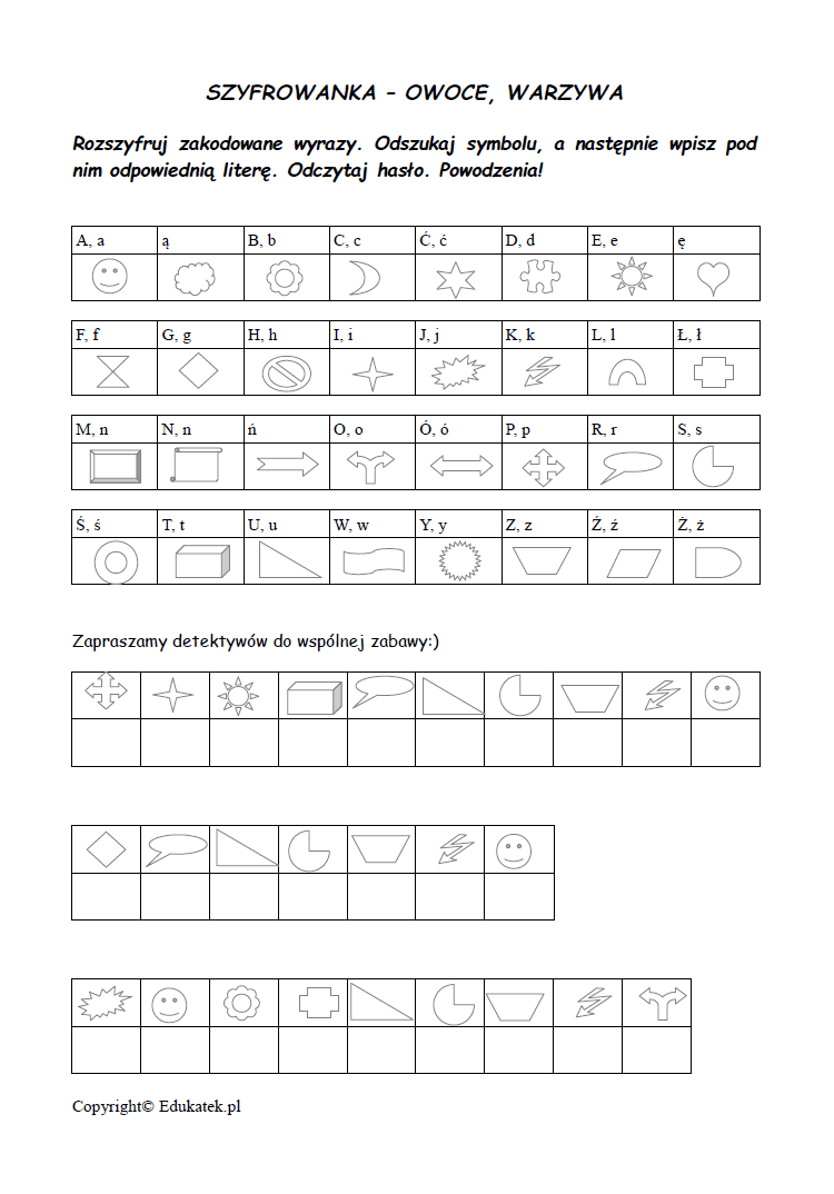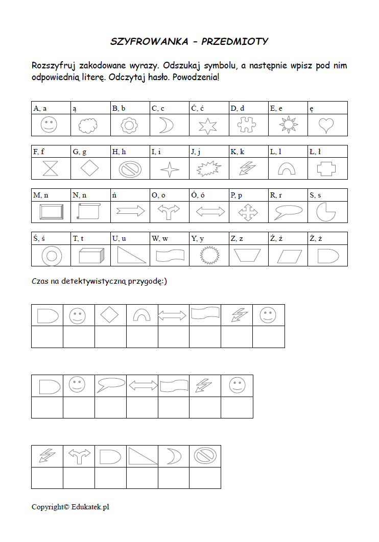 Zadaniem dziecka jest rozszyfrowanie zakodowanych wyrazów. Należy odszukać wybrany symbol, a następnie wpisać pod nim odpowiednią literę. Po rozszyfrowaniu odczytujemy hasło.