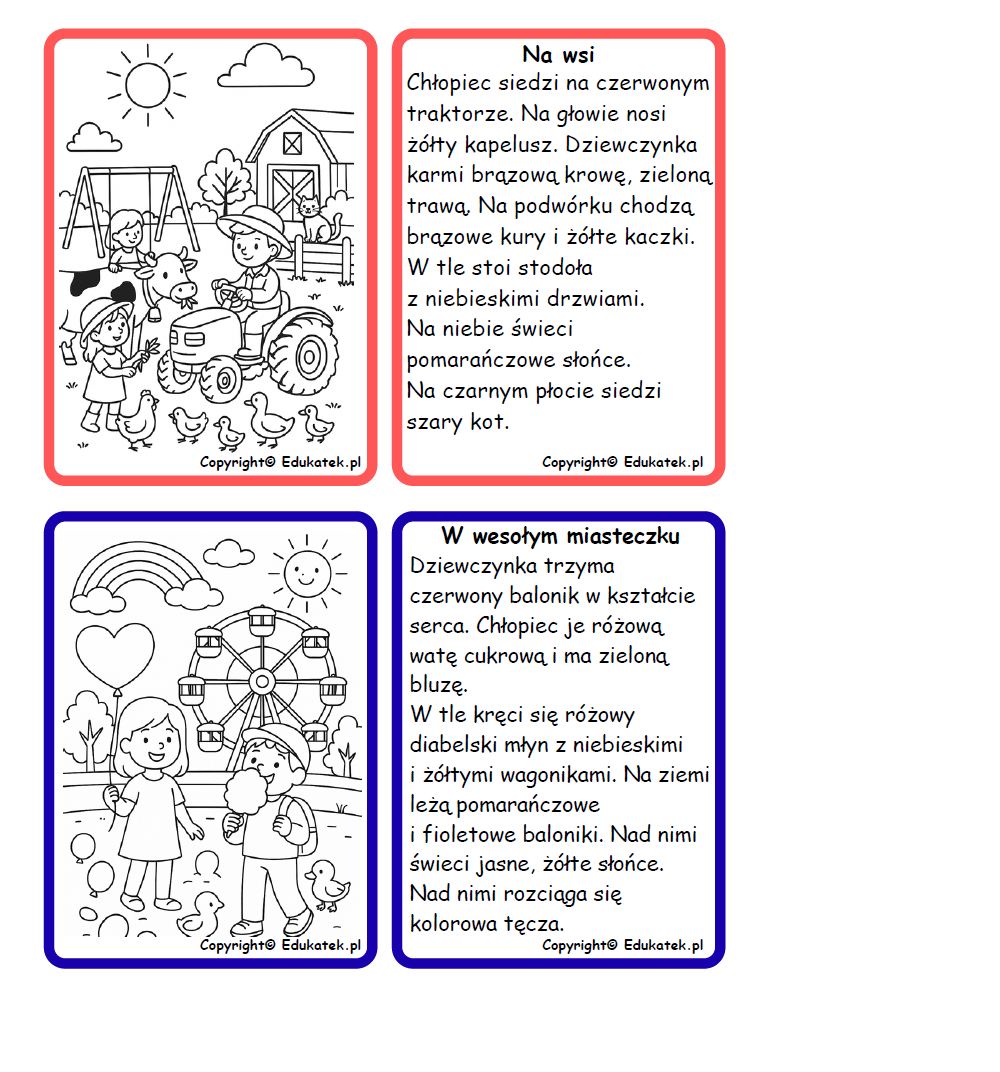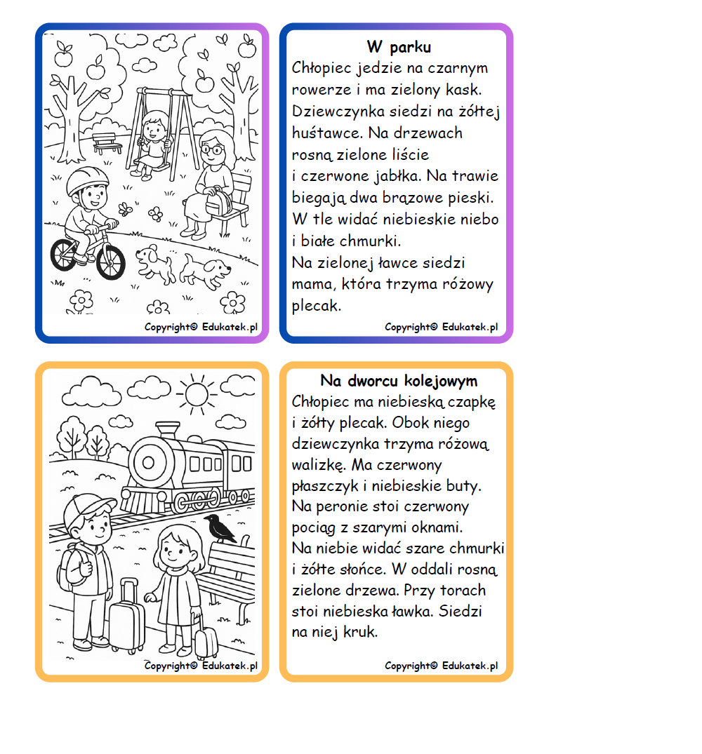 Zabawa utrwalająca czytanie – zestaw kart umożliwiający doskonalenie czytania ze zrozumieniem. Podczas zabawy dzieci utrwalają rozumienie samodzielnie czytanego tekst. W skład zestawu wchodzi 38 tekstów oraz 38 ilustracji. Komplet liczy 19 stron do samodzielnego wydrukowania.