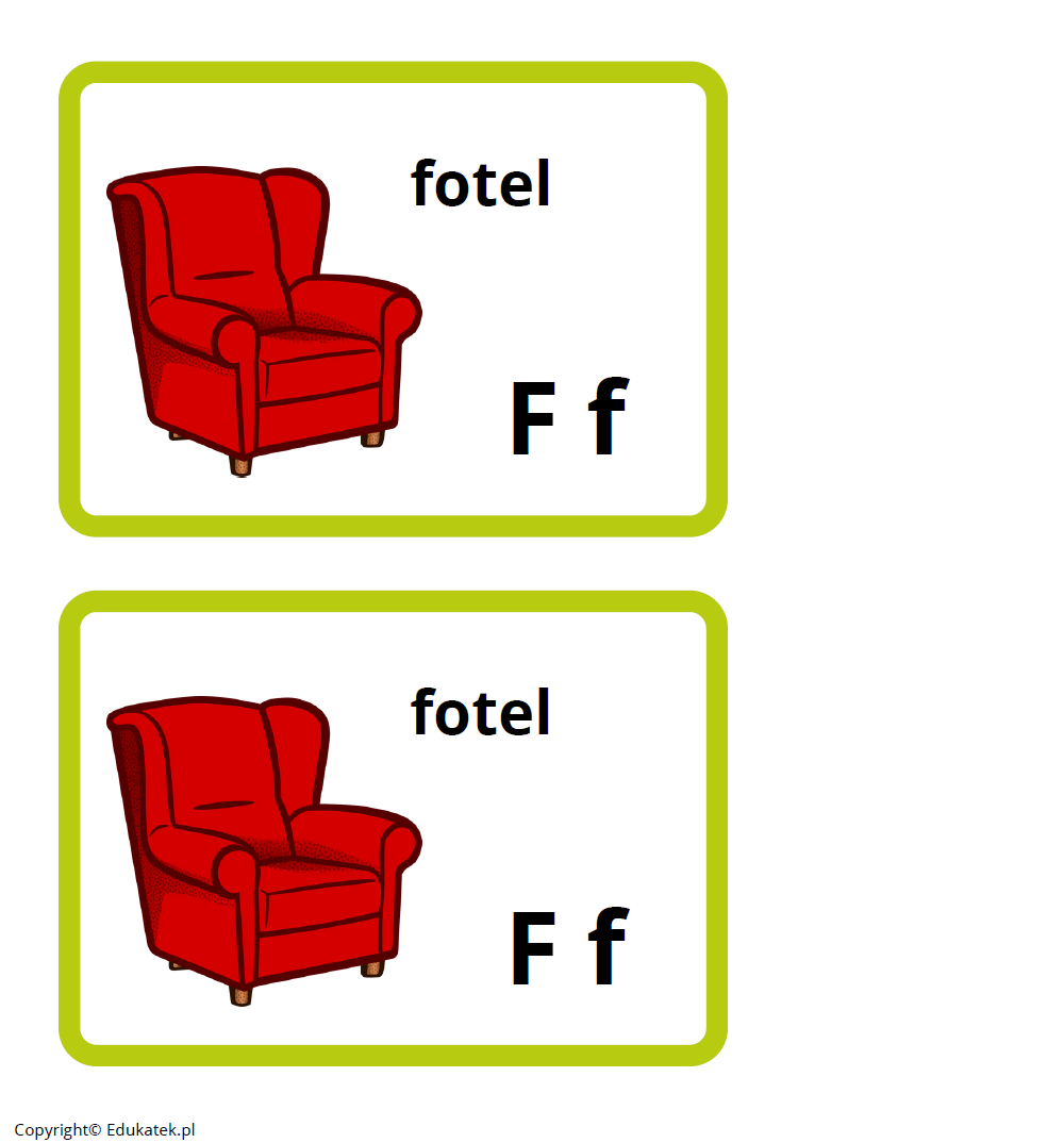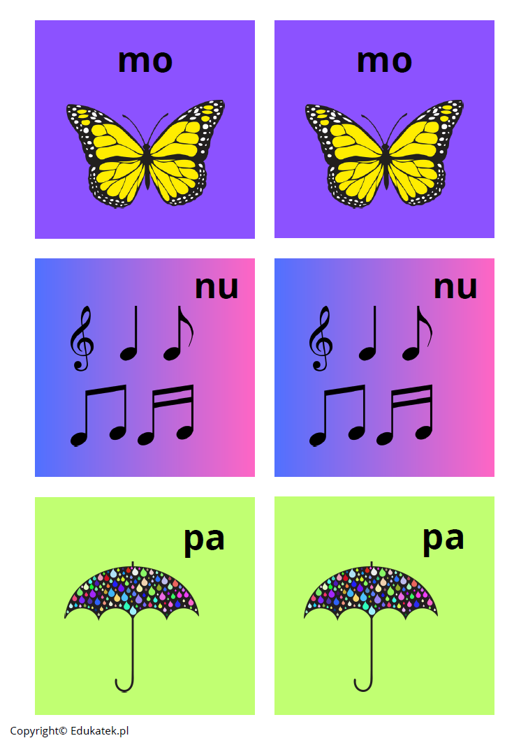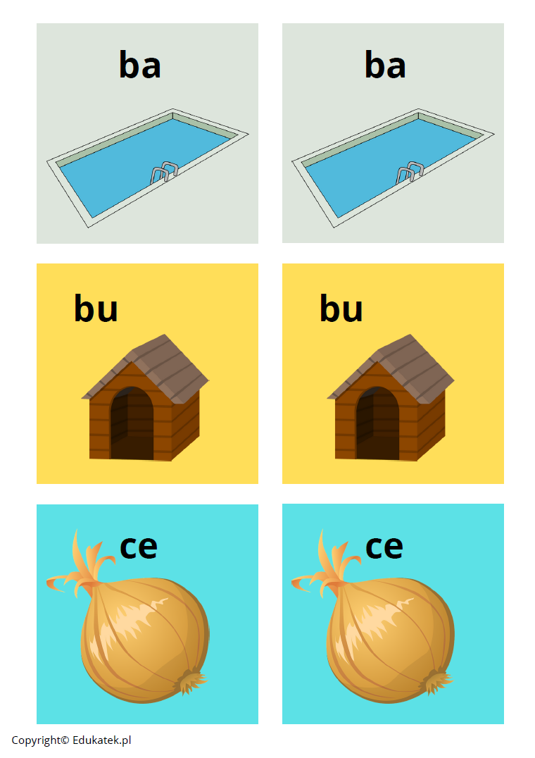 Wszystkie karty należy potasować, a następnie rozłożyć obrazkami do dołu. Na sygnał prowadzącego (nauczyciela, rodzica) wybrany gracz odkrywa dwie dowolne karty i głośno odczytuje literę/sylabę. Zadaniem uczestników jest jak najszybsze znalezienie tych samych obrazków. Za każdą odkrytą parę, gracz przyznaje sobie punkt. Wygrywa ten, kto zdobędzie największą ilość kart.