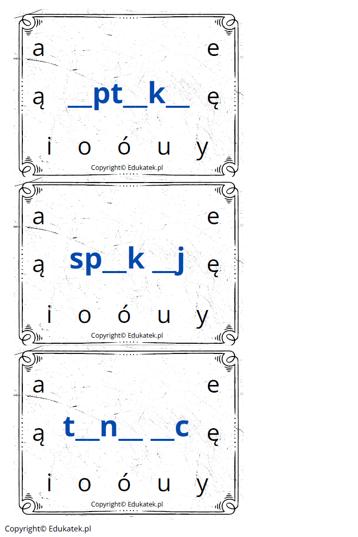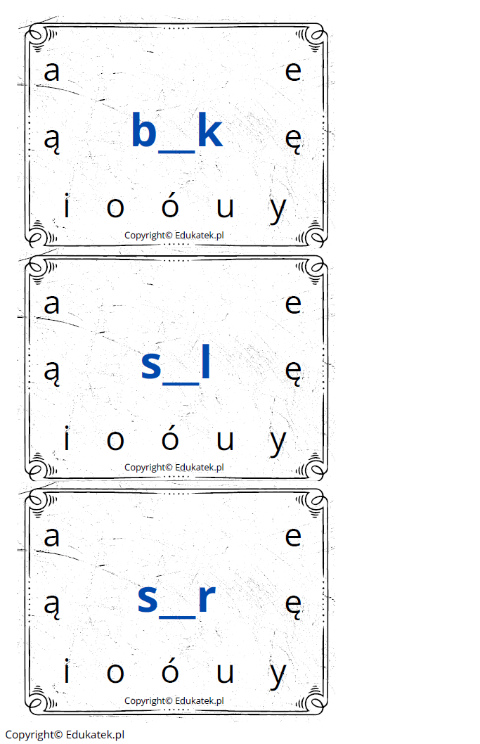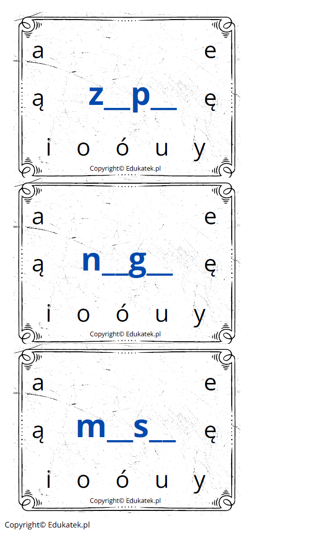 Zalaminowane i pocięte kartoniki należy potasować, a następnie rozłożyć na ławce, dywanie, itp. Zadaniem uczestników jest wskazanie/przypięcie klamerki/wpisanie brakujących samogłosek. Za każdy poprawny wyraz, gracz może przyznać sobie punkt.