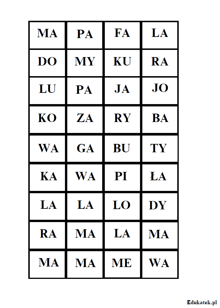 Karty edukacyjne do nauki czytania. W skład zestawu wchodzą 23 strony pomocy do samodzielnego wydrukowania. Podczas zabawy dzieci uczą się i utrwalają czytanie sylab.
