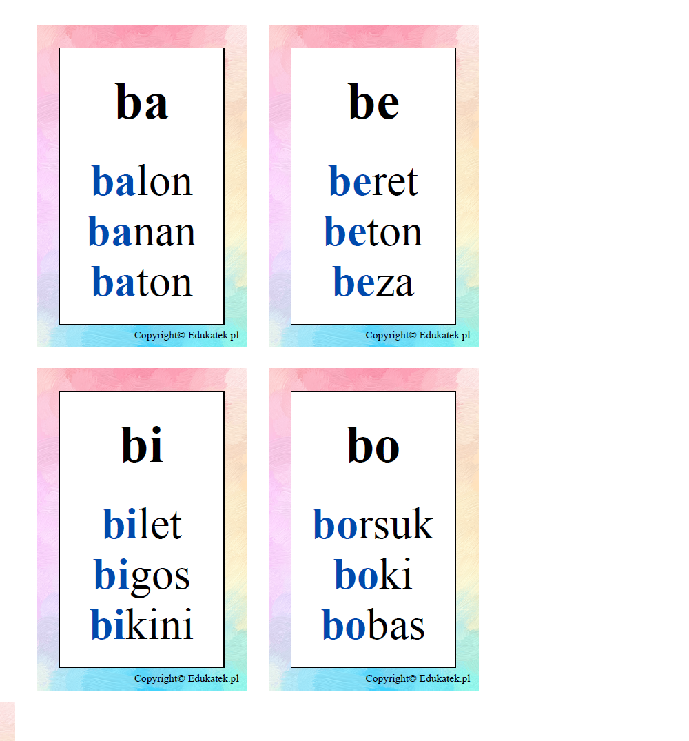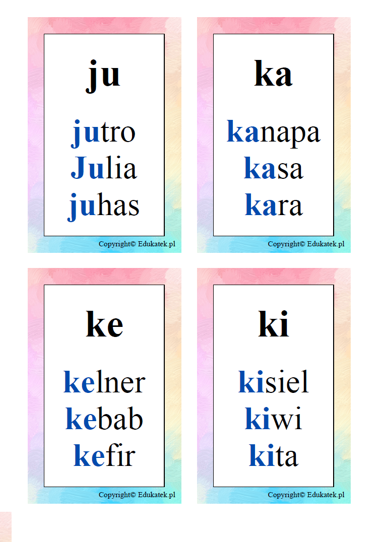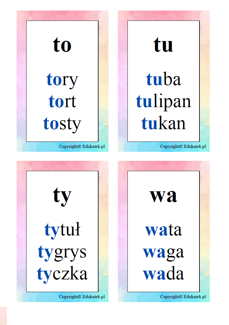 Dzięki tej zabawie dzieci doskonalą czytanie oraz rozwijają analizę i syntezę słuchową. W skład zestawu wchodzi 25 stron do samodzielnego wydrukowania ( 99 kart z sylabami i wyrazami). Nauczyciel, rodzic decyduje o ilości kart w grze oraz o trudności zadania. Dla dzieci słabo czytających polecam zabawę z krótszymi wyrazami (dziecko może wybrać 1 z 3 najprostszych wyrazów).