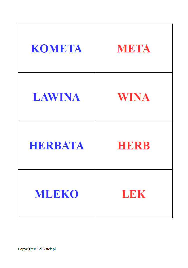 Zalaminowane i pocięte karty należy potasować, a następnie rozłożyć na ławce, dywanie, itp. Zadaniem uczestników jest jak najszybsze znalezienie par wyrazów lub par złożonych z wyrazu i obrazka (np. krokodyl-krok, sport-por). Za każdą odkrytą parę, gracz przyznaje sobie punkt. Wygrywa ten, kto zdobędzie największą ilość kart. Ważne jest, aby dziecko głośno odczytywało wyrazy.