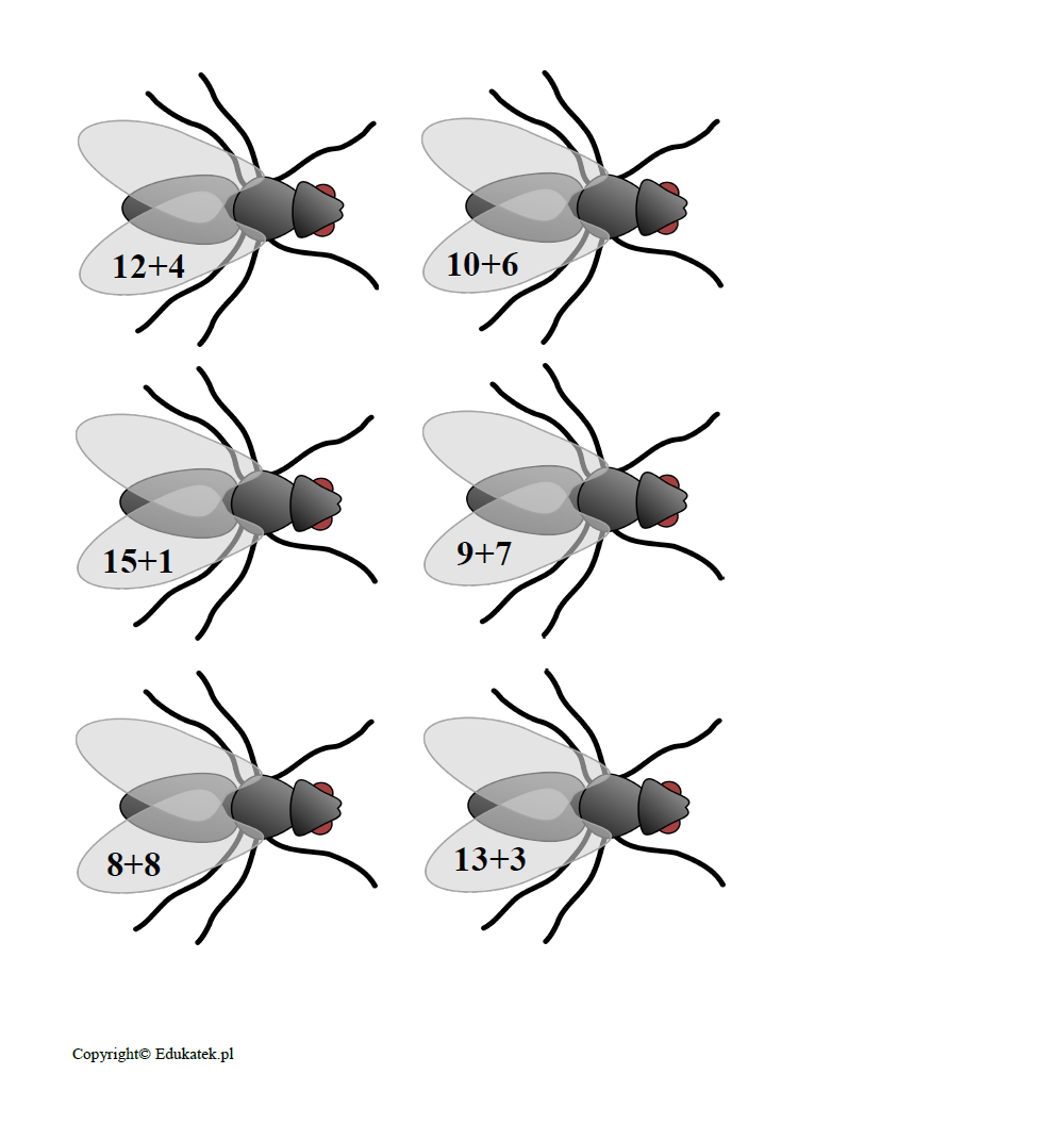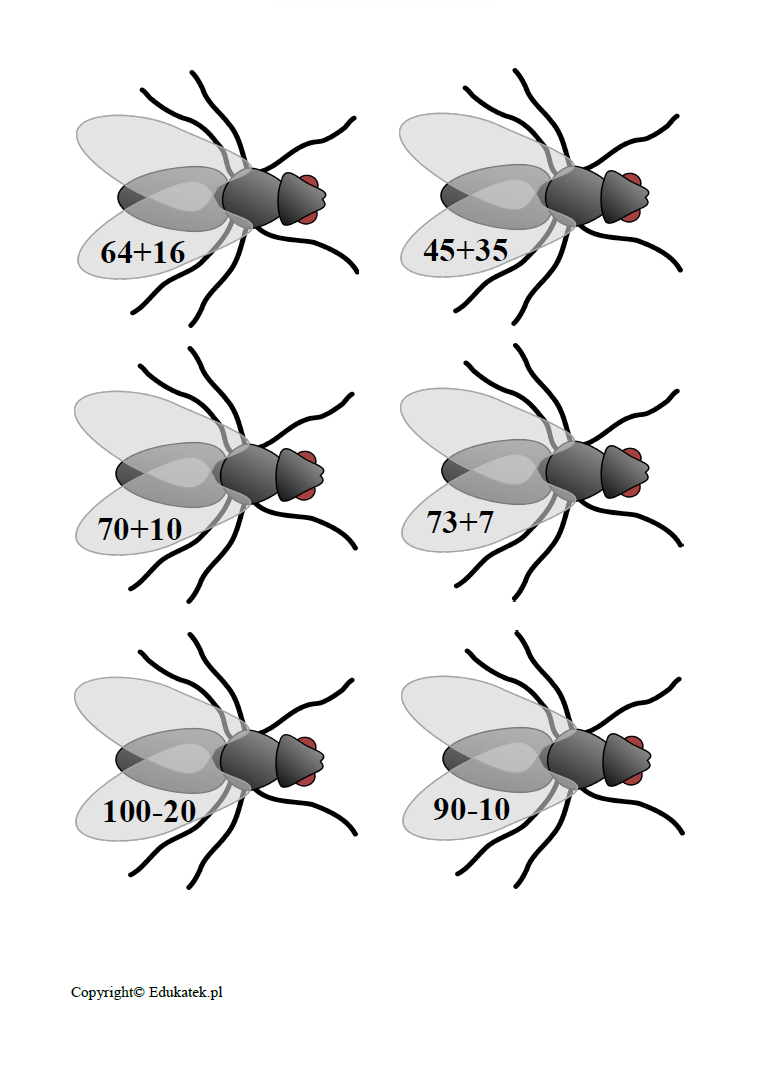 Gra matematyczna – zestaw elementów umożliwiający doskonalenie dodawania i odejmowania. Podczas zabawy dzieci utrwalają dodawanie i odejmowanie w zakresie 100. W skład zestawu wchodzi 36 stron – 152 muchy, na których napisane są działania (+,-) oraz 10 kart z wynikami. Przygotowany zestaw ma bardzo dużo możliwości wykorzystania.