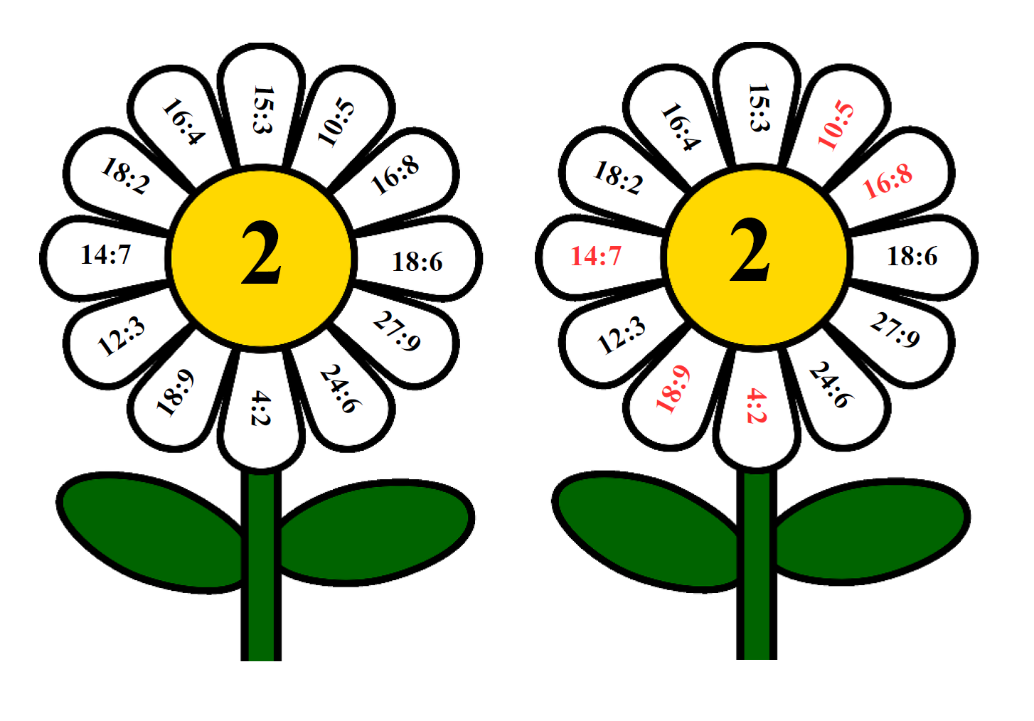 Dzieci grają w parach. Jedna osoba uzupełnia kwiatek poprzez wpisanie właściwego wyniku lub przypięcie klamerek w odpowiednich miejscach. Druga osoba sprawdza poprawność wykonania zadania, mając „kwiatek kontrolny”. Dzięki temu osoba, która sprawdza też utrwala właściwe wyniki.