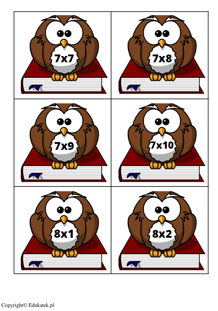 • Należy wydrukować strony z kartonikami, na których są sowy (bez działań) oraz strony z działaniami. Karty z działaniami powinny być pod spodem, a te z sowami u góry. Tak przygotowane zestawy 2 kartek należy zalaminować lub podkleić taśmą dwustronną.