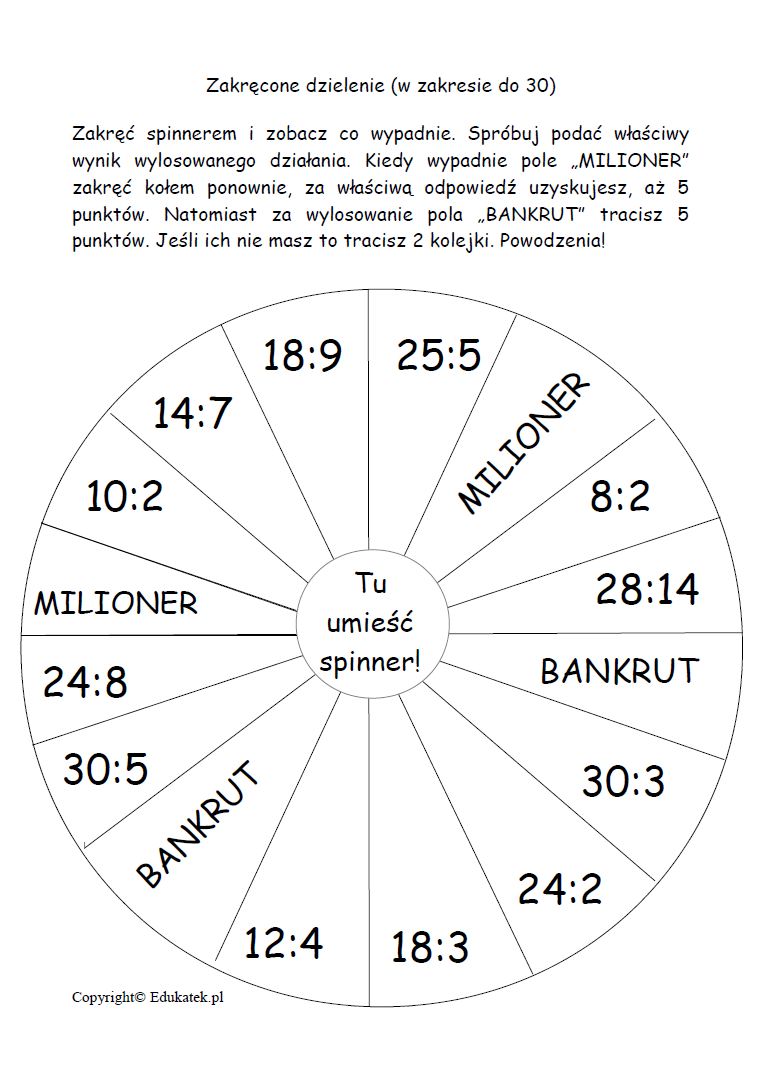 Tak przygotowany spinner należy umieścić w wyznaczonym polu na planszy. Dziecko kręci spinnerem i próbuje podać właściwy wynik wylosowanego działania. Kiedy wypadnie pole „MILIONER” kręci kołem jeszcze raz, za właściwą odpowiedź uzyskuje, aż 5 punktów. Natomiast za wylosowanie pola „BANKRUT” traci 5 punktów. Jeśli ich nie ma to traci 2 kolejki.